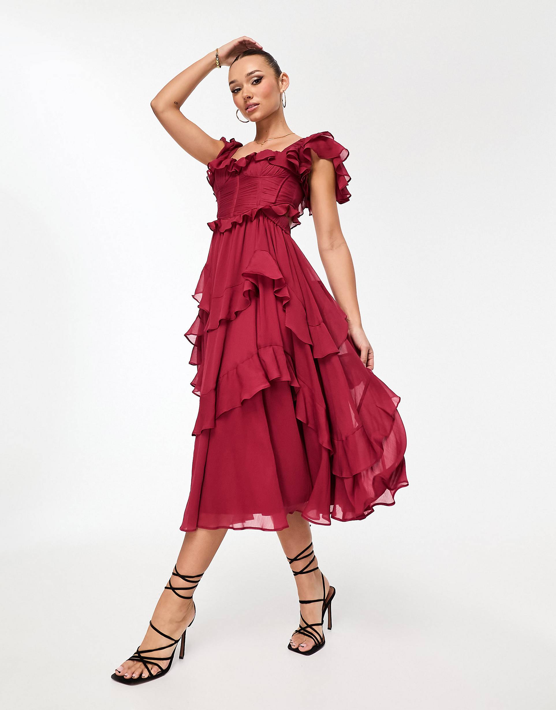 Cette robe HAVANA bordeaux est conçue en mousseline douce avec des volants en cascade sur une jupe asymétrique. Également dotée d'une encolure bénitier drapée avec des bretelles à volants, Havana est parfaite pour les vacances, les mariages et toutes les occasions estivales.