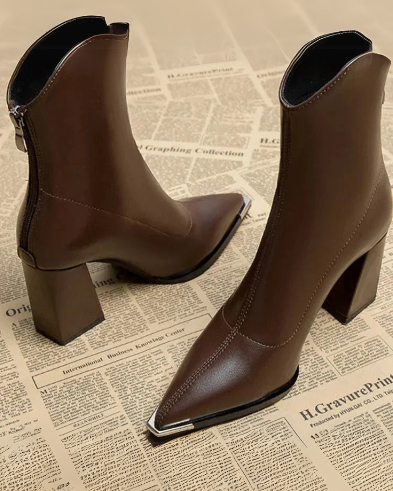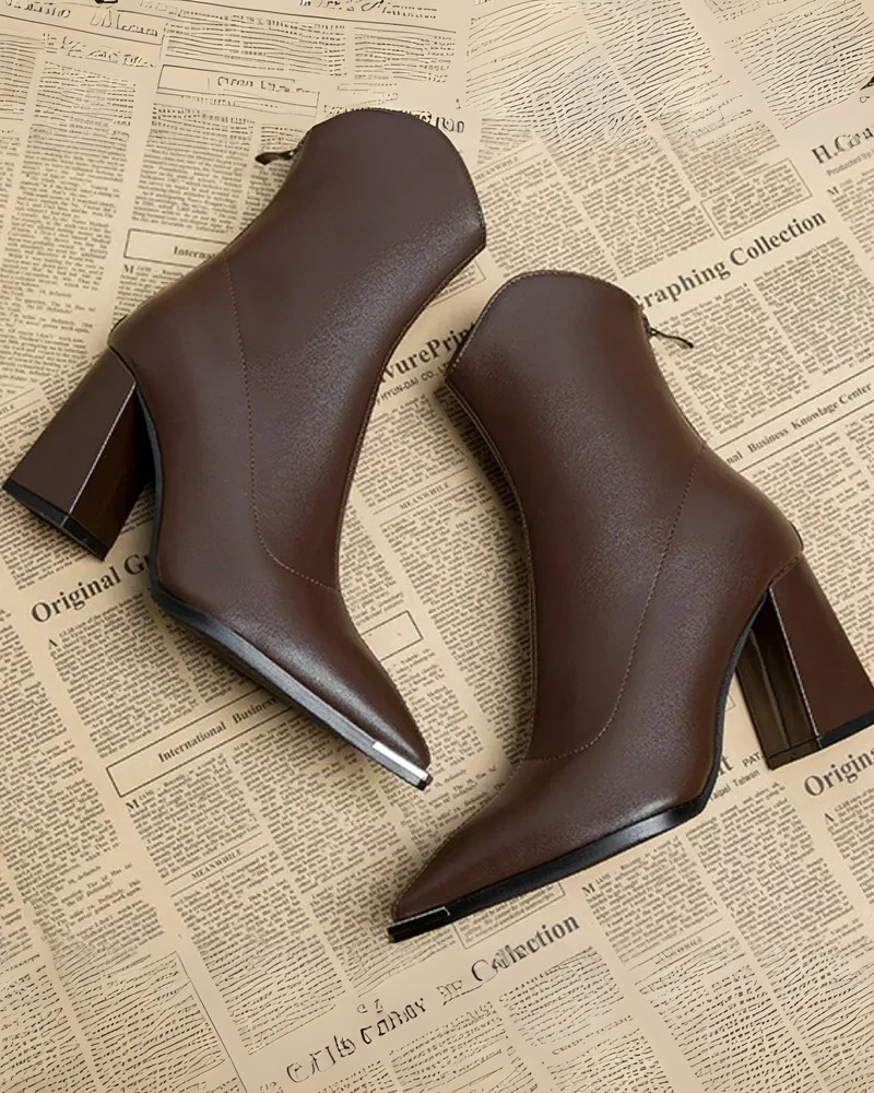 Des bottines en cuir avec une touche de caractère. Leur design épuré et séduisant est sublimé par un bout chromé éclatant, contrastant magnifiquement avec le cuir foncé et riche. Parfaites pour la saison, elles dégagent une allure sombre et magnétique.