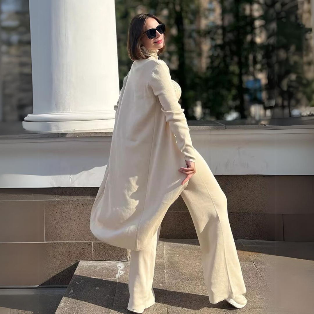 - Ensemble 3 pièces : Cardigan long, pull sans manches côtelé, et pantalon ample.