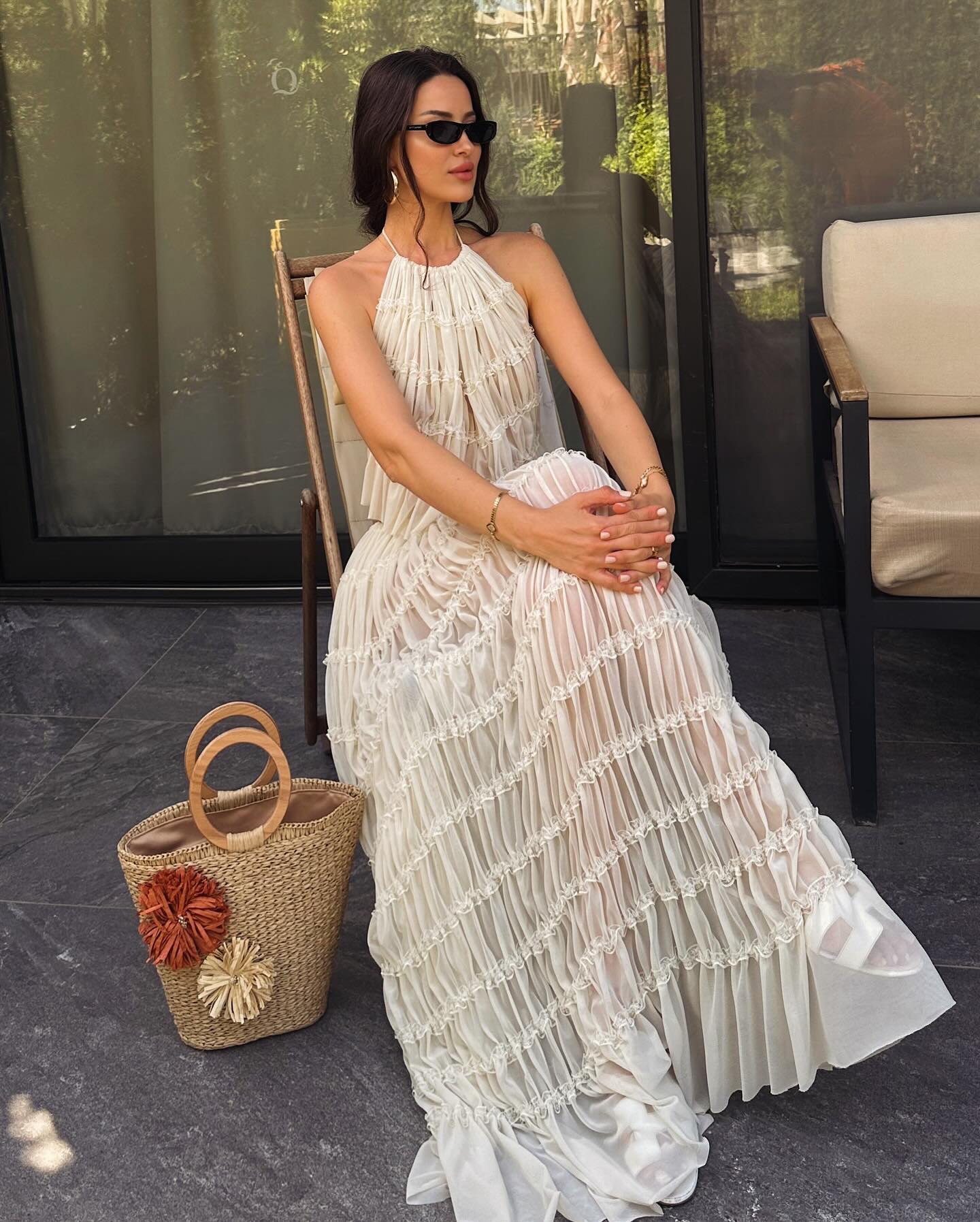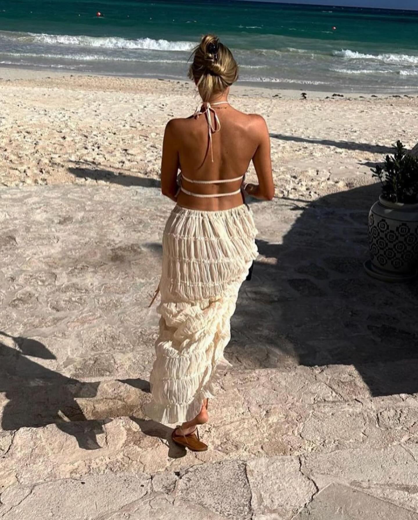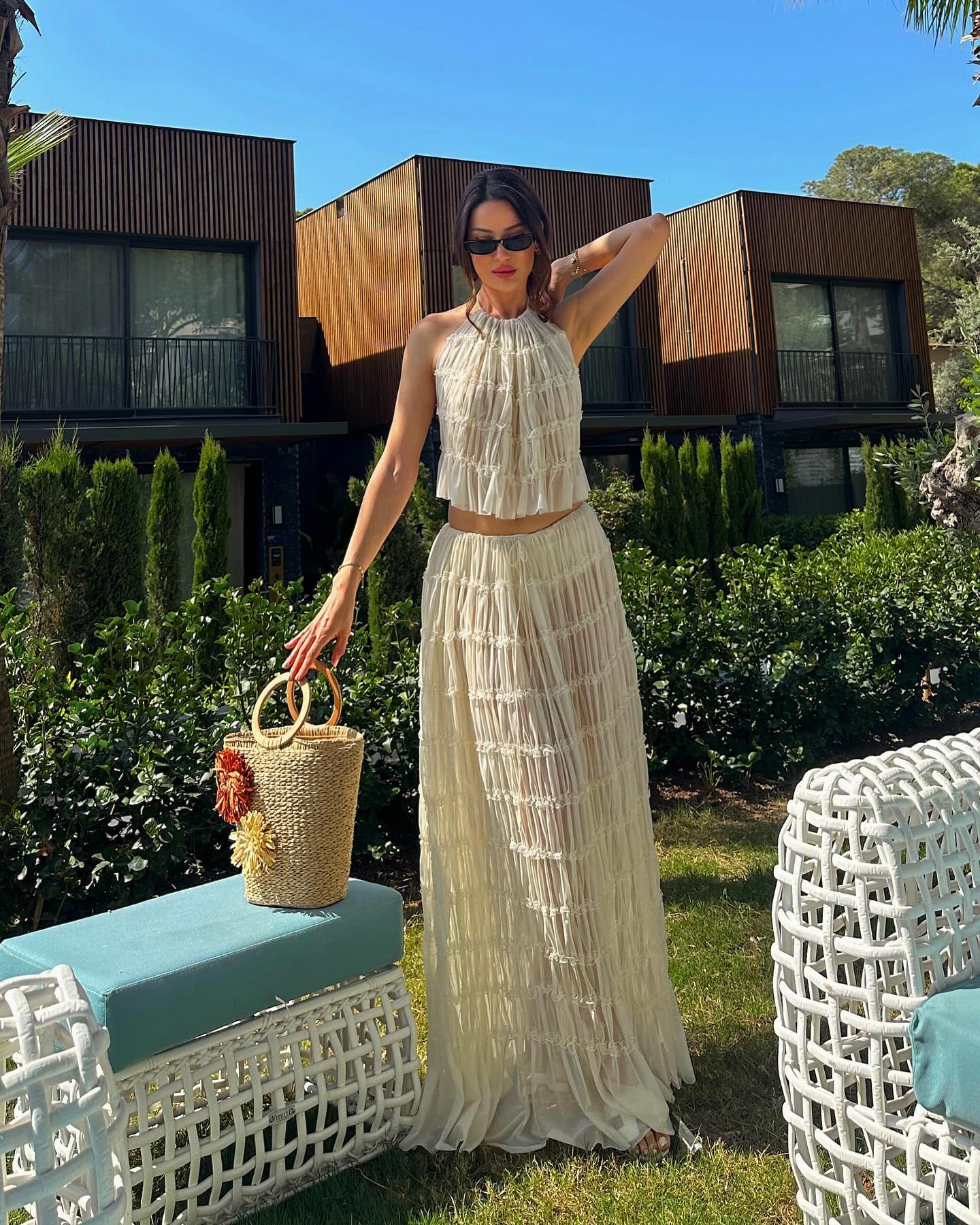 Découvrez l'ensemble Andromède, comprenant le top halter et la jupe assortie(comportant un dessous de robe cousue), une création inspirée du vintage avec des détails ruchés et de la dentelle délicatement bordée.