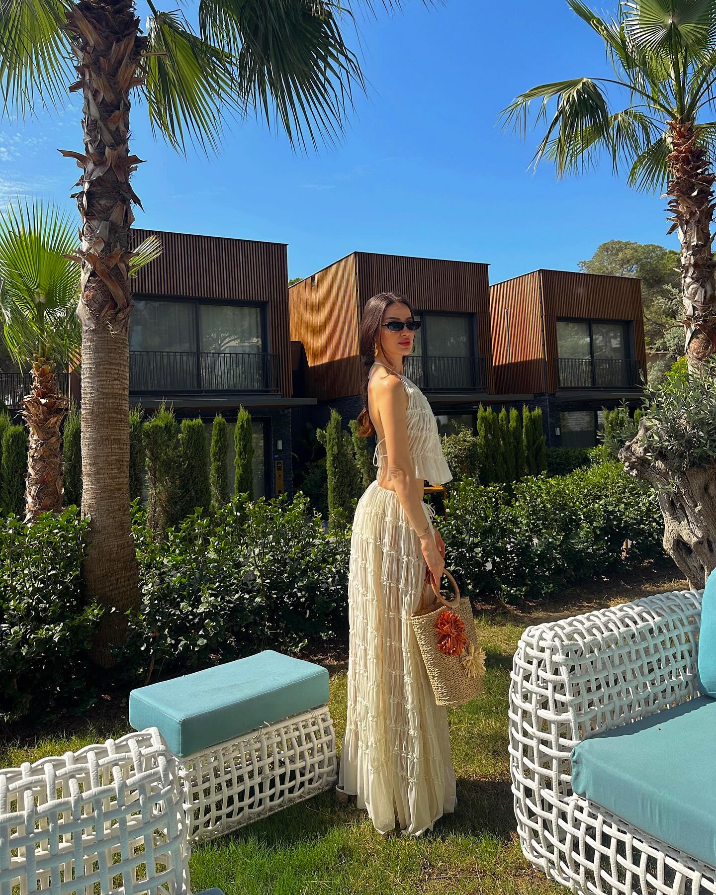 Fabriqué dans une teinte crémeuse chaude luxueuse, Andromède respire la romance et l'élégance intemporelle. Conçu pour offrir une polyvalence absolue, un lien ajustable s'attache au cou pour le top, tandis que des bretelles élastiques en satin subliment la taille.