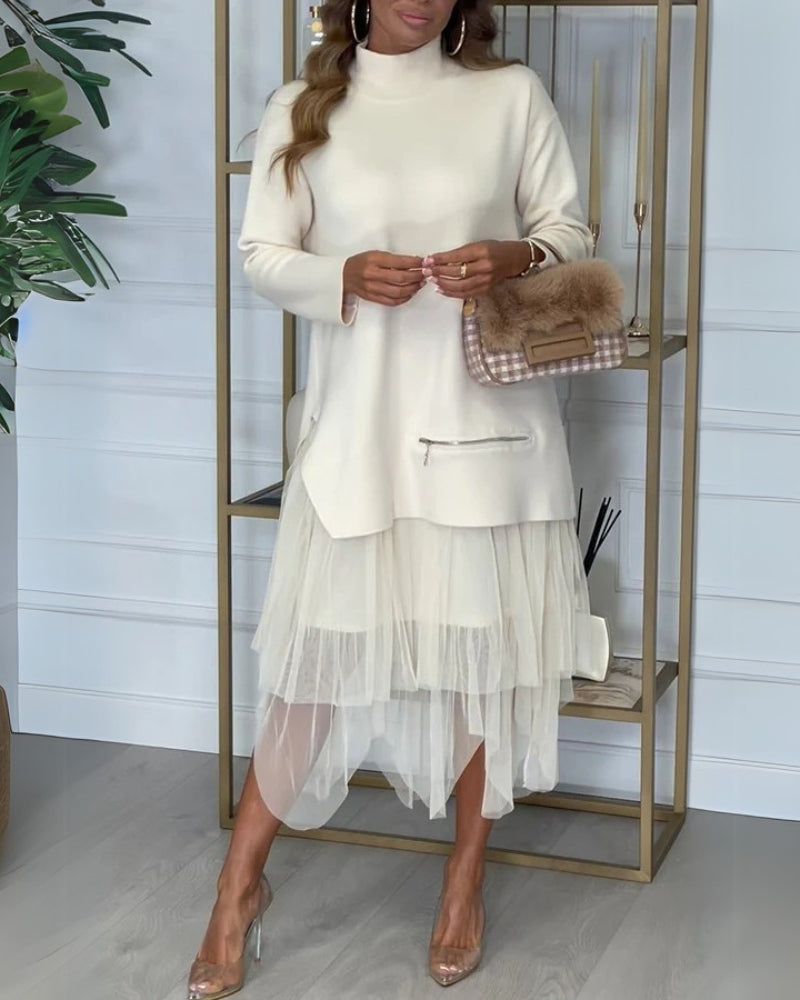 - Association de maille cosy et de tulle délicat, assurant à la fois chaleur et grâce.