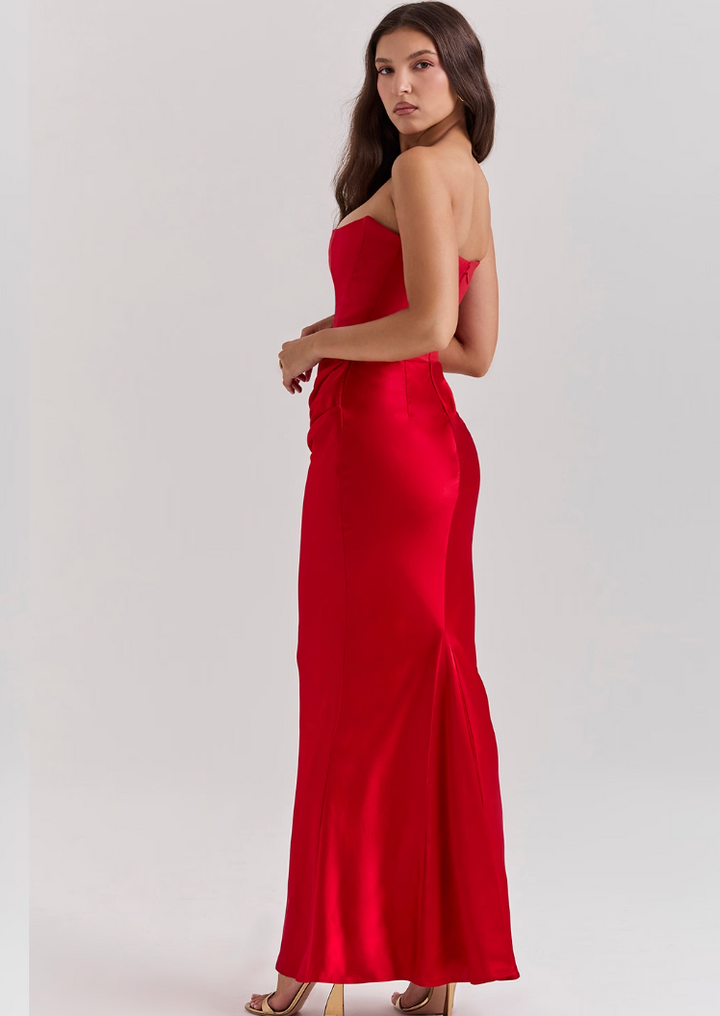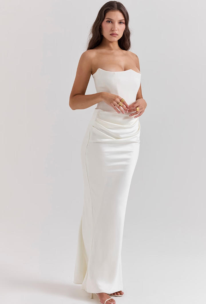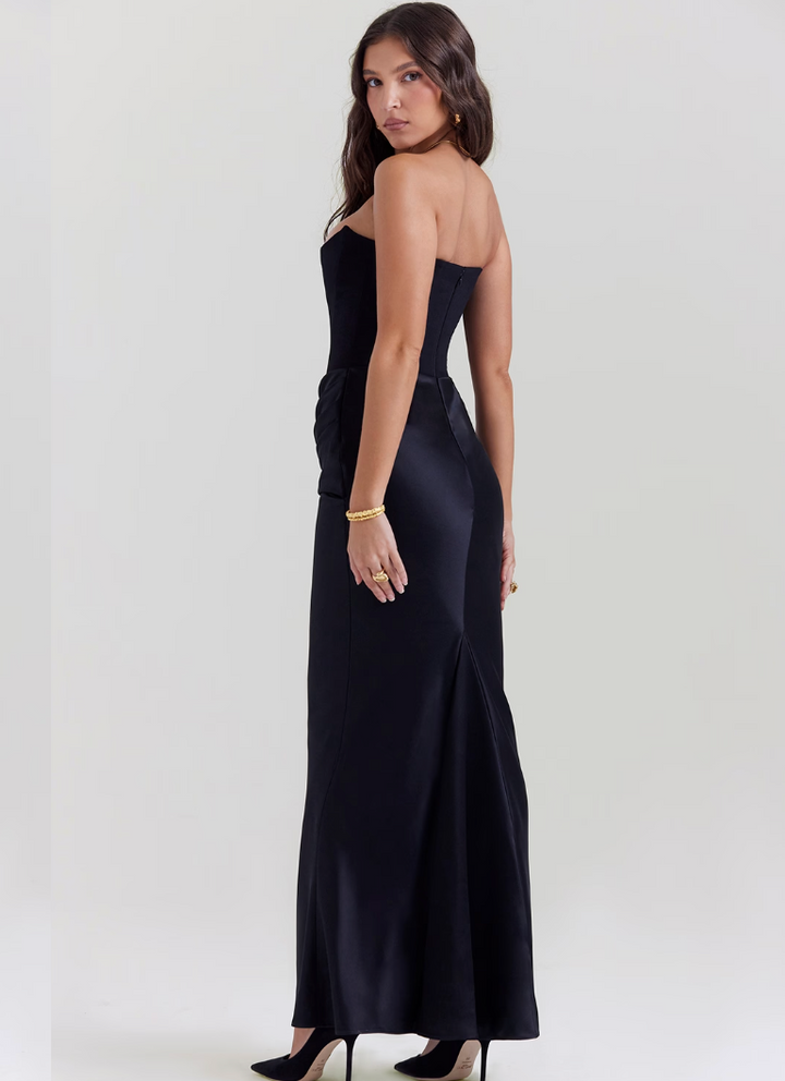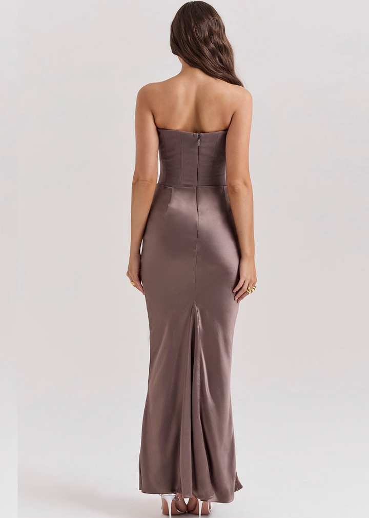 Un choix exquis pour les occasions formelles qui nécessitent une touche de glamour. Cette élégante robe de soirée sans bretelles présente une taille joliment froncée qui accentue la silhouette et crée un look flatteur et intemporel. Le tissu lisse tombe élégamment jusqu'au sol, offrant une apparence élégante et polie.